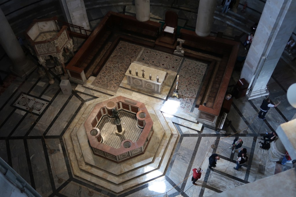 All of which led me, recently, to try to replicate what it feels like to see the world through cataracts. I chose a photograph I took in the Baptistery at the Piazza dei Miracoli in Pisa. There’s a strong element of dark and light in this scene which makes it easier to see the highlights glow, and the disorienting effect of looking down on the scene adds an element of abstraction. The detailed textures, too, allow me to demonstrate the impact of reduced contrast.